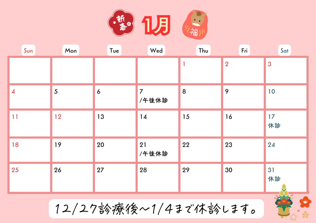 | 水 | 09:00~12:00 | 第1・3・5週目のみ 14:00~15:30(健診、予防接種のみ) 15:30~17:00(診療) 第2・4週目:休診 |